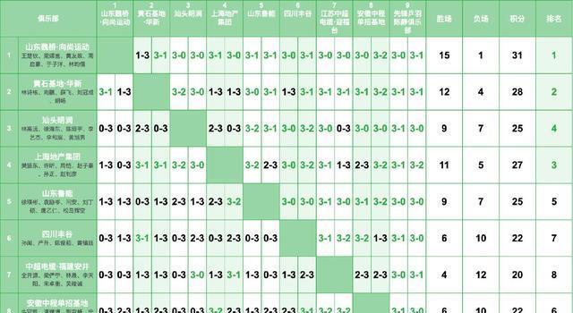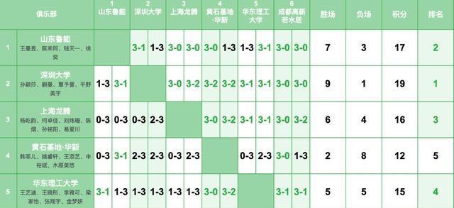 山东鲁能第二,7胜3负,输的三场分别是1-3深圳大学、1-3黄石基地、1-3华东理工大学。上海龙腾第三,6胜4负积16分,华工理工大学第四,5胜5负积15分。